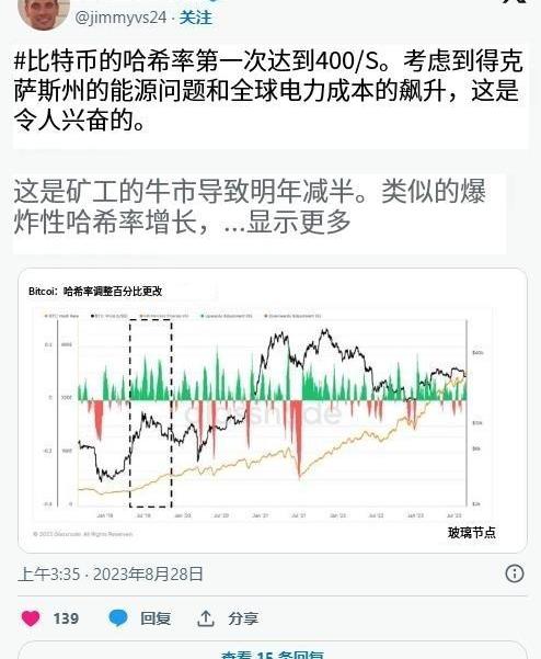 Glassnode分析師詹姆斯·斯特拉滕(JamesStraten)表示,比特幣網絡取得了里程碑式的發展,其哈希率達到了每秒400兆赫哈希,這是其歷史上從未見過的數字。