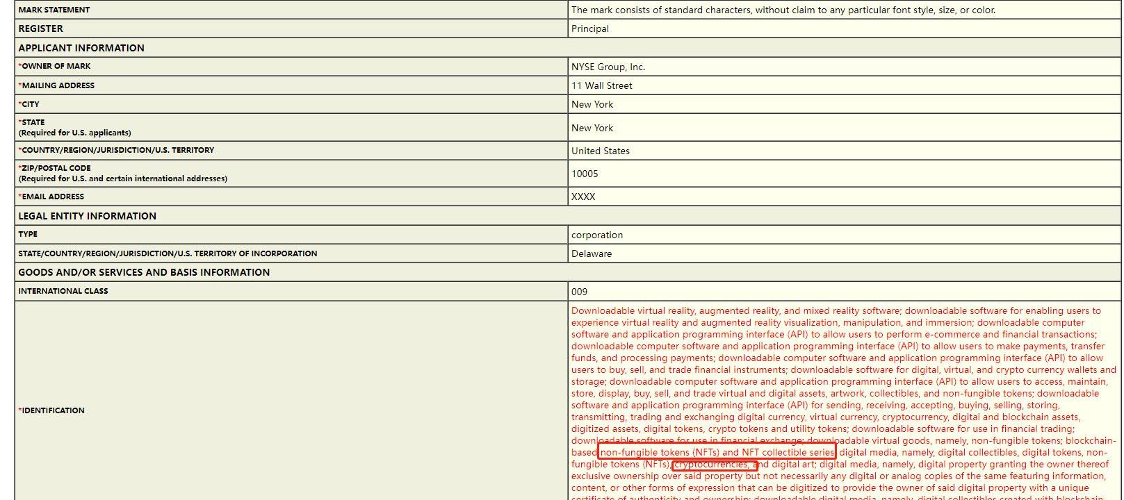 XRP/HKD-4.27%據彭博社2月16日消息,紐約證券交易所在2月10日向美國專利商標局提交的一份監管文件中表示,它希望建立一個NYSE品牌的交易所,以提供加密貨幣和NFT交易,并與OpenSea和RaribleInc.等公司競爭。不過,紐約證券交易所表示,它沒有立即推出加密貨幣或NFT交易的計劃,但會“定期考慮新產品及其對我們商標的影響,并相應地保護我們的知識產權。”