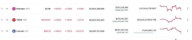 在最近的整合中,萊特幣(LTC)被Dai(DAI)取代,成為按市值計算的第12大加密貨幣,現在隨著最近的下跌,隨著TRON(TRX)的超越,該代幣已跌至第14位。