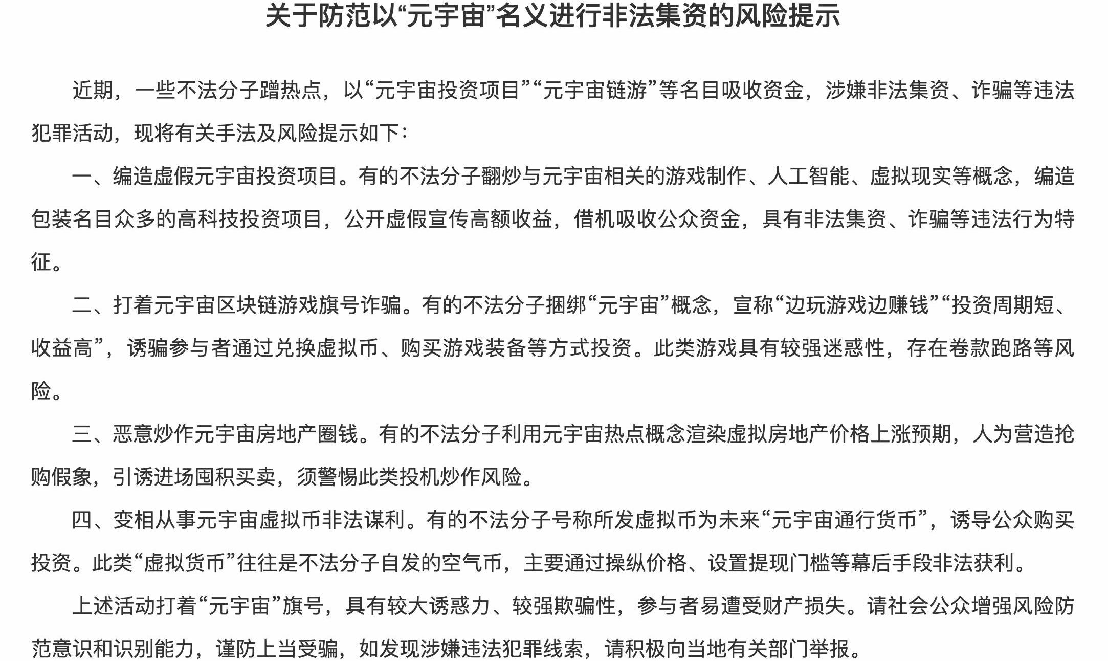 上述活動打著“元宇宙”旗號,具有較大誘惑力、較強欺騙性,參與者易遭受財產損失。請社會公眾增強風險防范意識和識別能力,謹防上當受騙,如發現涉嫌違法犯罪線索,請積極向當地有關部門舉報。