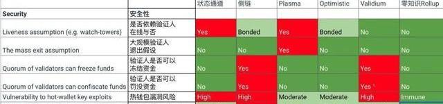 這被歸入了可用性范疇。提現時間和交易是否可以即時確認,是值得關注的兩個方面。Plasma和Optimisticrollups的方案,從表中看到,提現時間預計較長。不過,如果引入了流動性提供者,相應提現時間會大大縮減,而DeFi方案目前通常都會有LP的設計,所以圖中所示的1周提現時間盡管看來離奇得長,但是也只是理論預估而已,實現起來的實際時間會遠小于此數值。
