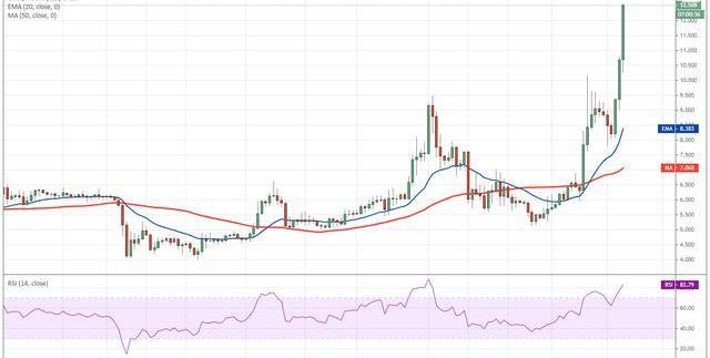 HT從2月1日的6.4808美元飆升至今天的盤中高點19.4555美元,在三周內上漲了200%。這一大幅上漲將RSI推高至88以上,表明HT近期處于超買狀態。