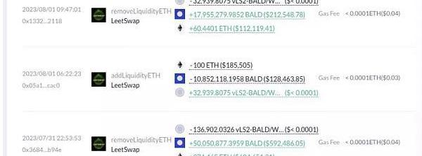 通過Debank上的數據分析我們可以發現,最早是從2023/07/3002:58:33起,項目的部署地址開始在Bald的流動性池子中注入ETH。該地址向流動性池子中轉入了多筆ETH,總計超過6470枚ETH,而從2023/07/3119:38:55開始,該地址開始從流動性池子中撤出ETH,分四比總共撤出了超10704枚ETH。隨后又在從2023/07/3120:49:01向流動性池子中分三比總共注入400枚ETH,隨后便又是撤出ETH,又注入,但都是幾百枚的進進出出,到了2023/08/0109:47:01,該部署項目的錢包終于停止了對于流動性池子的操作呢,最后一筆的操作便停在了撤出了一筆60枚ETH的流動性。
