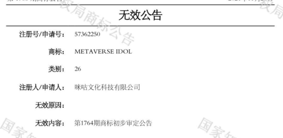 據中國商標網發布的公告顯示,中國移動旗下咪咕文化科技有限公司此前注冊的多個“METAVERSEIDOL”商標被宣布無效,而這些商標已于2021年10月20日通過初審,并進入公告階段,公告期為三個月。