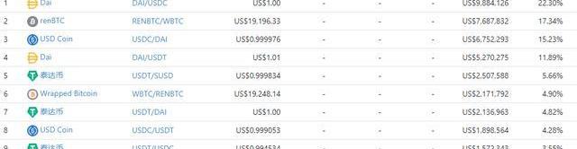 前十中有8個都是穩定幣,除了RENBTC和WBTC。當然我們都知道Curve是一個穩定幣交易的DEX。