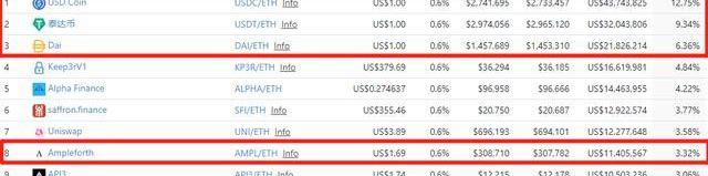 下面是從Uniswap網址截的圖,顯示的是昨天的流動性池中金額排名前10的代幣對。其中,第二是ETH+USDT,第三是ETH+USDC,第四是ETH+DAI,第五是HKMT+USDT,第十是ETH+AMPL。