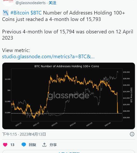 此外,持有至少100BTC的地址數量已暴跌至15,793個,這是2022年12月的最低點。這進一步證實了對重新分配趨勢的猜測。這些地址在4月初為15,997個。