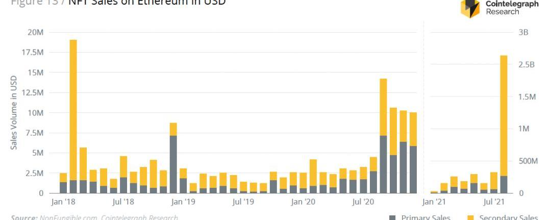 2018-2021年Ethereum(以太坊)上的NFT銷售額,數據來源:NonFungible.com,CointelegraphResearch