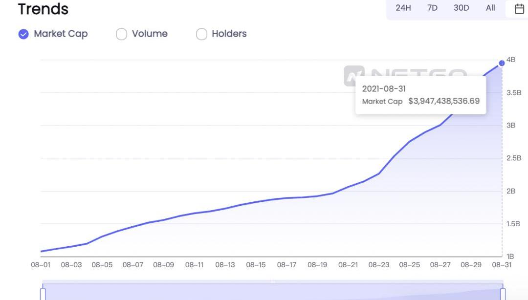 2021年8月NFT市值增長曲線陡峭,8月31日近40億美金,月增長率為400%,NFT市場火熱程度可見一斑。