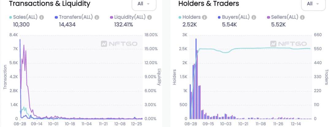 BAYC的交易量&流動性BAYC的持有者&交易者變化曲線,數據來源:nftgo.io