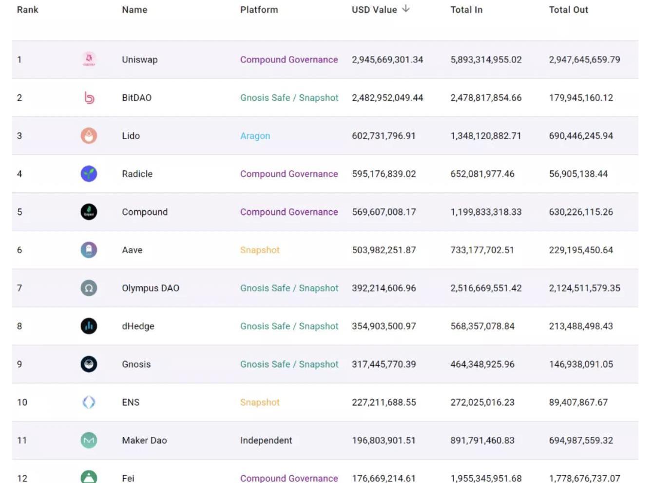 其中,資金管理規模最大的DAO組織分別是Uniswap、BitDAO、LidoDAO、Radicle、Compound等。