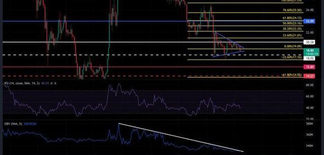 ETC形成對稱三角形K線走勢圖形態,處于看跌行情結構。