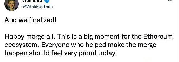 合并,代表著以太坊主網從工作量證明到權益證明的過渡,合并的進程完成,也意味著這一過渡完成,意味著對于以太坊來說大規模顯卡挖礦時代結束、意味著以太坊網絡將完全在權益證明算法下運行、意味著以太坊的電力支出將較之前水平下降99.65%。VitalikButerin在社交平臺發文慶賀這一時刻“以太坊合并完成!這是以太坊生態系統的重要時刻。每個幫助實現合并的人都應該感到非常自豪。”