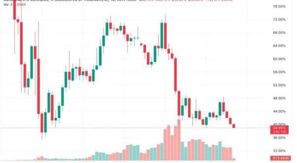 按市值占主導地位的全球最大加密貨幣四年來首次跌破39%。