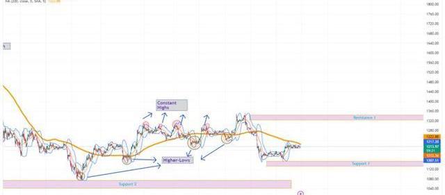 接近12月中旬,ETH獲得了觸及阻力位1($1320-$1350)的勢頭。在ETH達到阻力位1后不久,它暴跌至支撐位1。目前,ETH在1200美元附近盤整,其上方的200日均線是直接阻力。如果多頭大力推動ETH,那么它的目標可能是達到阻力位1。