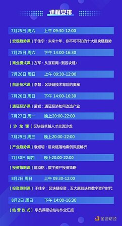 剛剛學霸報名的區塊鏈卓越人才特訓營(第五期),會在7月25日到8月2日線上開課。這個課程邀請的都是區塊鏈行業大佬級別的人物,而且還可以進行全年的選修課學習。課程都是在周六日和平時的晚上進行,對上班族來說也十分友好。