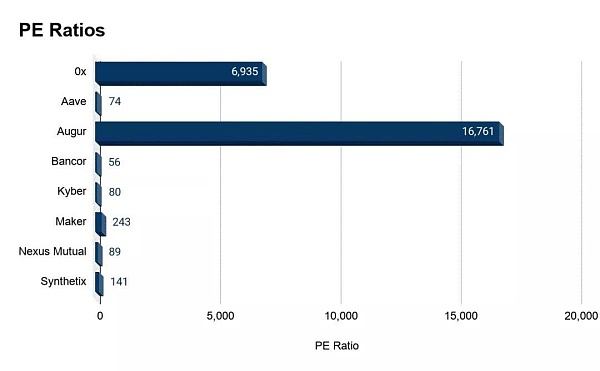 計算結果表明,在所有附有代幣的 DeFi 項目中,有兩個明顯的異常值:Augur(REP)和 0x(ZRX),比率分別為 16,761 和 6,935。作者表示,這種現象可能表明投資者對這兩個流動性和衍生工具協議有很大的增長期望。