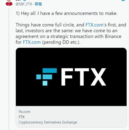 11月9日晚上,FTX創辦人SBF在推特發文稱與幣安就FTX戰略投資達成協議,并表示「事情又回到了原點,FTX第一個和最后一個投資者都是一樣的。」