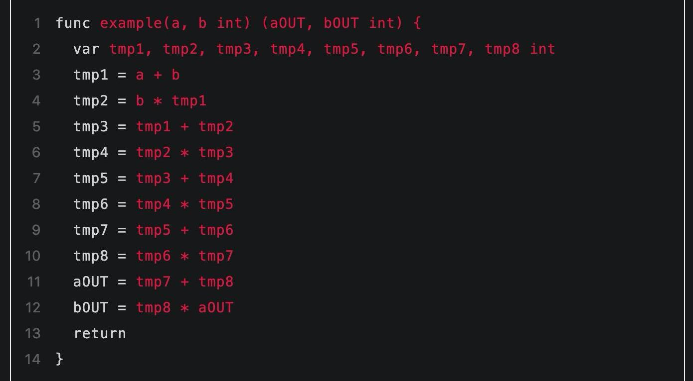 這里需要注意到程序中值被存儲在變量中,而電路中的值是用電路門之間的連線表示的。這其中有個關鍵的不同是:變量的值是會隨著時間變化的,而電路中連線的值是固定不能改變的。因此首先我們通過引入一些中間量的方式表示隨循環而不斷變化的各階段的變量值,中間量命名為tmp1,tmp2...這樣的形式: