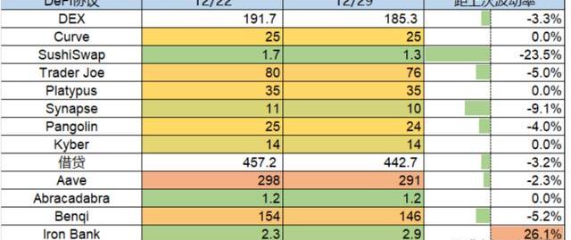 本周整體TVL變化較小,依舊維持向下趨勢,本周下降0.86B,下降幅度為2.16%,下降幅度略低于BTC和ETH下跌幅度,呈現小幣種持倉向主流轉移,小幣種跌幅更大的趨勢。