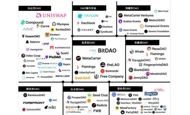 在DAO的社區治理實現后,組織的發展取決于社區共識,也就是組織的目標。基于組織的目標,目前可以把智能合約平臺發展的DAO應用可以分成幾大類,主要包括:協議型DAO、投資型DAO、贈款型DAO、服務型DAO、媒體型DAO、社交型DAO和收藏型DAO。