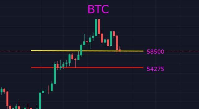 BTC有兩個關鍵點位,第一個是58500,第二個是54275。從更高的層面上來講此次的幣價下跌還屬于自然回撤,此次的最低回調點位還是會落這兩條線之間,價格會展開向上的追逐。