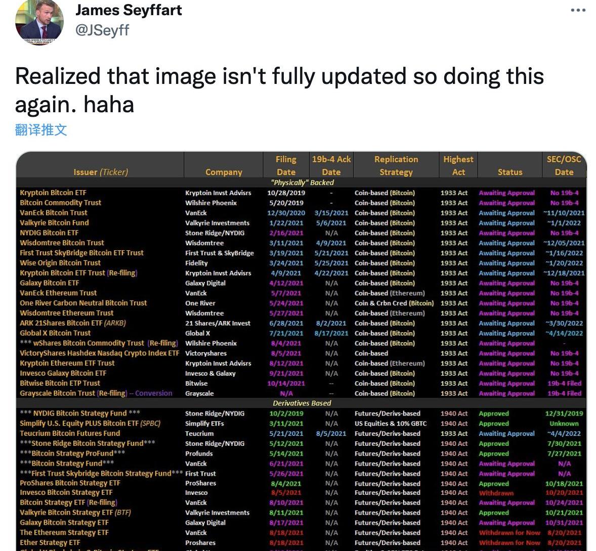 XRP/HKD+1.19%根據彭博高級ETF分析師JamesSeyffart分享的數據,有36只加密貨幣交易所交易基金正在等待美國SEC審批。目前美SEC已經審核通過4只比特幣相關ETF,其中最引人注目的是由21Shares和ARKInvest聯合創建的Ark21SharesBitcoinETF。在等待審核的36只基金中,最新的申請來自10月27日的AXSInvestment,它們是AXS比特幣策略ETF和AXS做空比特幣策略ETF。絕大多數待上市基金尋求直接購買BTC,或其期貨和衍生品。一些基金采取了混合策略,只將部分資產投資于BTC,其余資產投資于美國股票或區塊鏈股票。然而,也有3只基金專注于匹配ETH的業績。它們是VanEck以太坊信托、Wisdomtree以太坊信托和Kryptcoin以太坊信托。