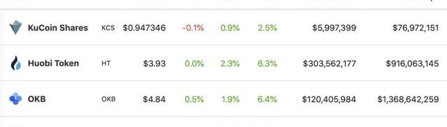 今日平臺幣板塊整體也呈現震蕩行情,24小時級別來看,KuCoin平臺幣KCS上漲0.9%,HT上漲2.3%,OKB上漲1.9%,BNB上漲3.5%。