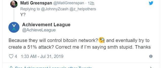 當然,推特用戶也有些陰謀論者。AchieveLeague認為這是一個可怕的消息:“因為他們會控制比特幣網絡?并最終試圖造成51%的攻擊?“