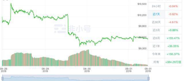 本周比特幣分別有一次極速拉升和下跌。首先是自8月26晨間開始的拉升,3小時漲幅達6%;3日后的凌晨,比特幣開始斷崖式下降、跌穿1萬美元,14小時累計跌幅達8.5%。此后幣價在9350-9700萬美元之間波動。幣價7日跌幅擴大至6%。