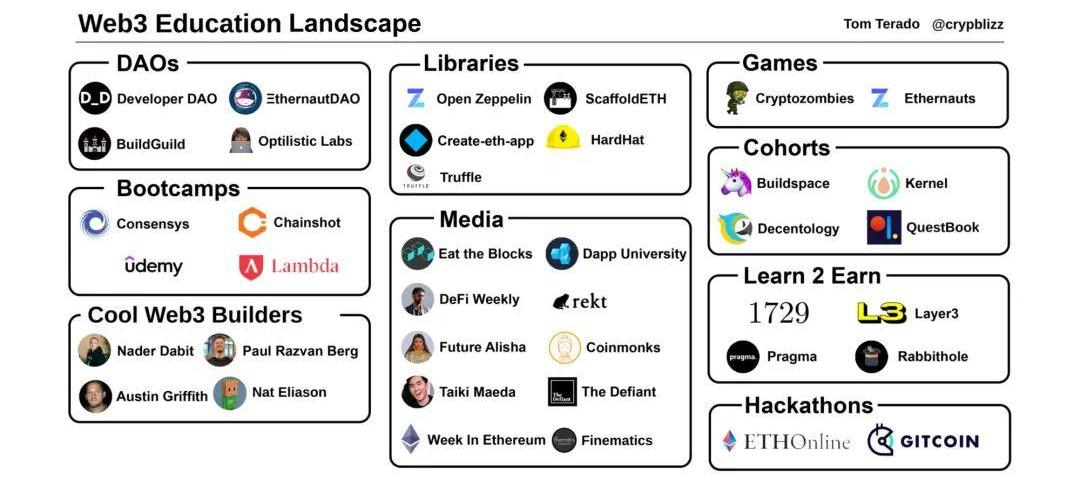 Consensys開發者訓練營:10-12周的在線開發者訓練營課程。Chainshot:在一個教練指導和具有挑戰性的訓練營中快速發展你的以太坊開發人員職業生涯。Lambda學校:在線編程學校和訓練營。Udemy:EdTech平臺上的幾門區塊鏈課程。