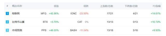 此輪漲勢由匿名幣、山寨幣主導——7日漲幅最高的板塊為物聯網、比特幣山寨、市場預測、匿名貨幣。其中,四個板塊分別由MFG、BTX、PPS、XUN領漲,七日漲幅各自達到45.96%、3.70%、46.55%、12.84%。
