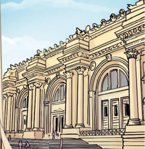 比如美國的大都會藝術博物館,繪本里展現的是一大張博物館的解剖圖,博物館的雕塑區、名畫區。彩繪了人們參觀博物館的場景圖,博物館里的各種展品:鎮館之寶埃及丹鐸神廟、漂亮的鎧甲。還有彩繪的博物館外觀和展廳。