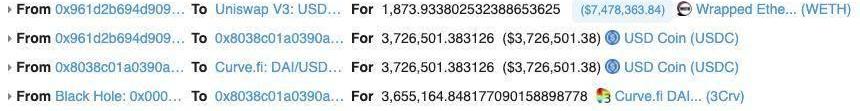 隨后為了獲得yDAI/yUSDC/yUSDT/yTUSD4Pool憑證以操控價格,攻擊者用約1,873個ETH從UniswapV3中兌換出約745萬個USDC,并通過Curve3Pool將其兌換成DUSD代幣約338萬個。