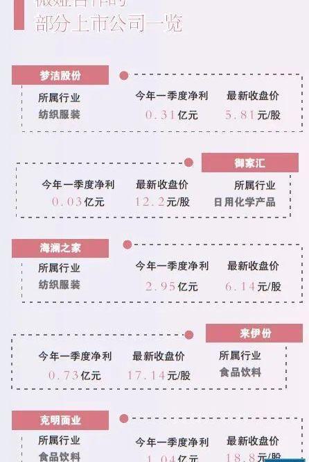近年來薇婭已開始打造自己的A股朋友圈,經統計,薇婭與龍大肉食、御家匯、海瀾之家、來伊份等18家上市公司有過合作,上述18股橫跨食品飲料、日用化學產品、紡織服裝等七大行業。
