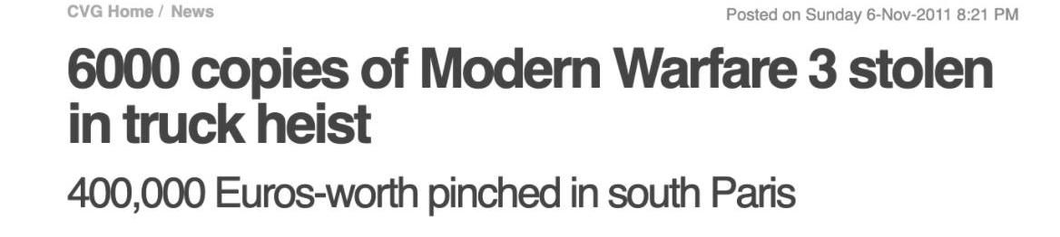 2011年,動視的《使命召喚:現代戰爭3》是有史以來銷售最快的文化產品,在16天內達到了約650萬套及10億美元的銷售量。