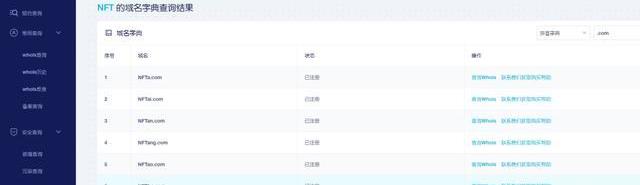 ①查詢“NFT”相關域名注冊情況,只需輸入關鍵詞“NFT”,就能得到全部注冊信息:
