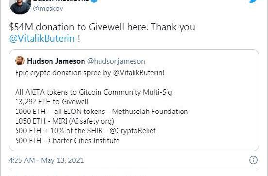 此外包括BalajiSrinivasan在內的許多企業家,已向印度加密貨幣救濟基金捐款。而上周,Buterin已向該基金捐贈了約60萬美元的代幣。