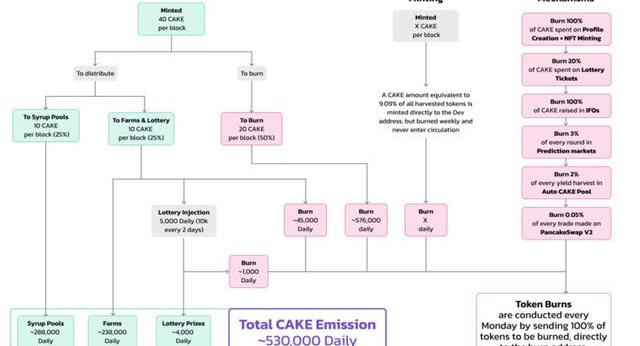 最新的CAKE代幣釋放和銷毀機制可以總結為下圖: