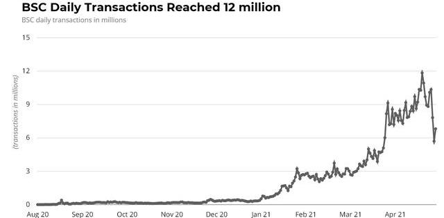 BSC最大的價值主張之一是其廉價的gas費用模式和快速執行。例如,5月18日,以太坊上交換代幣的平均成本是~40美元,而在BSC上是~0.2美元。高昂的gas費用對許多零售用戶來說過于昂貴,因此,在過去的幾個月里,BSC網絡在幾乎所有的關鍵指標上都享有拋物線式的上漲。據下表顯示,BSC網絡的日活躍地址,即衡量作為發送方或接收方在網絡上活躍的唯一地址,在2021年5月從不到100個增加到了超過100萬個,甚至已經超過了以太坊網絡的地址。