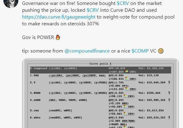 veCRV被用于CurveFinance的治理,該協議目前由一個DAO(去中心化自治組織)控制。veCRV持有者可以提交新的提案(前提是擁有至少2500枚veCRV),以及對提案進行投票(沒有最低數量要求)。投票可能很有用,比如可以通過提高某些特定的流動性池的獎勵來激勵LPs將資金存入這些特定的池,甚至可以改變CRV的代幣經濟學,比如通過燃燒(銷毀)CRV代幣來減少通脹。例如,在CRV代幣推出不久,就有人在市場上購買了大量CRV并用于鎖定在CurveDAO上,然后投票支持把Curve上的Compound池的APY(年化收益)上調至308%(見下圖);在另一個不那么極端的例子中,Yearn提議將更多的Curve每日獎勵流向Yearn相關的池。