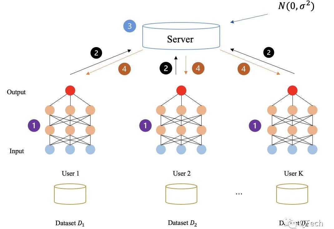 下圖所示:采取差分隱私對中間數據進行加密后的聯邦學習流程,各方生成的中間數據不再是明文傳輸計算,而是添加過噪聲的隱私數據,以此來進一步增強訓練過程的安全性。