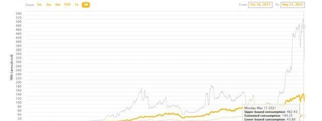 國際能源署(IEA)數據顯示,2019年比特幣“挖礦”消耗50至70兆瓦時,大致相當于如瑞士般體量國家的消耗量(每年消耗63太瓦時)。CambridgeBitcoinElectricityConsumptionIndex(劍橋比特幣電力消費指數)實時數據則更使人憂心,截至北京時間5月17日,比特幣總能源消耗43.89-482.43兆瓦時(TWh)之間,均統計約為140.25兆瓦時,這個數字超過了瑞典2019年全年的耗電量(131.8太瓦時)。