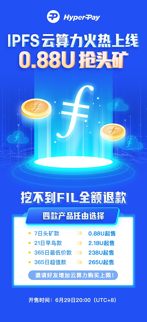 所有HyperPay出售的Filecoin云算力產品挖不到FIL,將全額退款。
