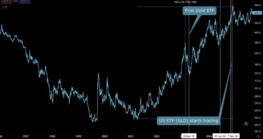 由于更多的交易者更容易獲得貴金屬,這也意味著新的交易參與者可以通過ETF獲得黃金敞口,而無需保管金屬、聘請審計師、將其存放在銀行等,是不是聽起來很熟悉?隨著新交易者在公開市場上購買這種資產更加容易,之后發生的事情就順理成章了。