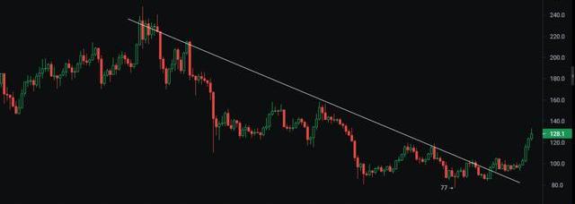以太坊這一波徹底突破趨勢線的走勢利弗莫爾在很早之前就叫粉絲們注意了,并且說了,一旦突破后,只要不橫著、亦或是大幅度加速收很長的上影線而慘淡結束的話,很有可能這一波的領漲者就是挑戰者。