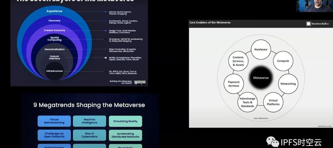Experience?是我們實際參與的內容:游戲、社交體驗、現場音樂、購物等?Discovery是人們了解體驗存在的方式?CreatorEconomy?是幫助創作者為Metaverse生產物料,并從中獲利的一切:設計工具、動畫系統、圖形工具、貨幣化技術等??SpatialComputing是指將對象帶入3D、計算到世界中的對象并允許我們與它們進行交互的軟件。它包括3D引擎、手勢識別、空間映射和支持它的AI。Decentralization是將生態系統的更多部分轉移到無需許可、分布式和更加民主化的結構的一切。HumanInterface是指幫助我們訪問虛擬世界的硬件——從移動設備到VR耳機,再到高級觸覺和智能眼鏡等未來技術。Infrastructure是半導體、材料科學、云計算和電信網絡,它們使構建任何更高層成為可能。