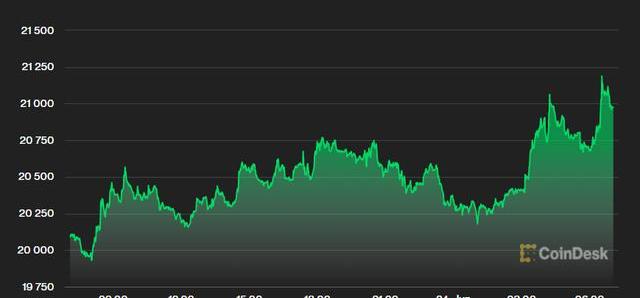 XRP/HKD-0.61%根據報價平臺CoinDesk的數據,北京時間6月24日7時08分,比特幣價格報21030.46美元,24小時漲幅近4.6%,最高觸及21200美元。