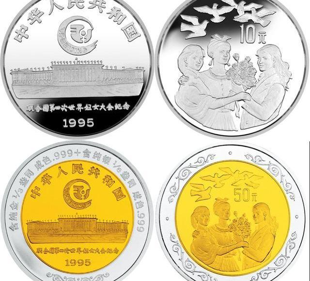 1995年9月4至9月15日,聯合國第四次世界婦女大會在中國首都北京舉行。這是我國首次舉辦國際性大會。為紀念本次大會,中國人民銀行發行了聯合國第四次世界婦女大會貴金屬紀念幣一套,包括1枚1盎司銀幣和1枚金銀雙金屬幣。兩枚紀念幣的正面主景圖案均為人民大會堂。幣面的人民大會堂以遠景正面角度完全呈現,大場景的展現盡顯人民大會堂的包容與雄偉。人民大會堂建筑上飄揚的旗幟特別顯眼,也是對世界婦女大會勝利召開的慶祝。