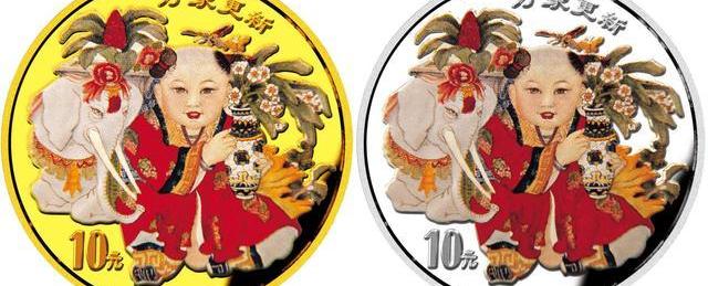 1998年中國傳統吉祥圖金銀紀念幣背面圖案中,童子懷抱棒槌瓶,瓶內插著盛開的水仙花。瓶寓意平安,水仙花寓意幸運。每逢新年,人們都希望萬象更新,平平安安,鴻運當頭。